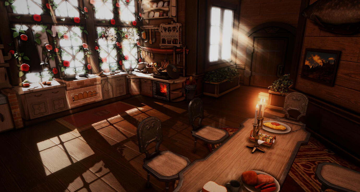 The communal kitchen and banquet room have been combined, creating a more intimate dining space. Westbound light of the morning sun filters through flourishing rose trellises, making for a truly halcyon breakfast. The pantry is kept well-stocked with non-perishables, as well as wooden flatware carved by local artisans. Curiously, a gargantuan specimen of a fish adorns one of the walls. It is said to be the largest carp ever pulled out of Fallgourd lake, but asking the taxidermist responsible for the mount will reveal that only the skin, teeth, head, and fins are genuine.