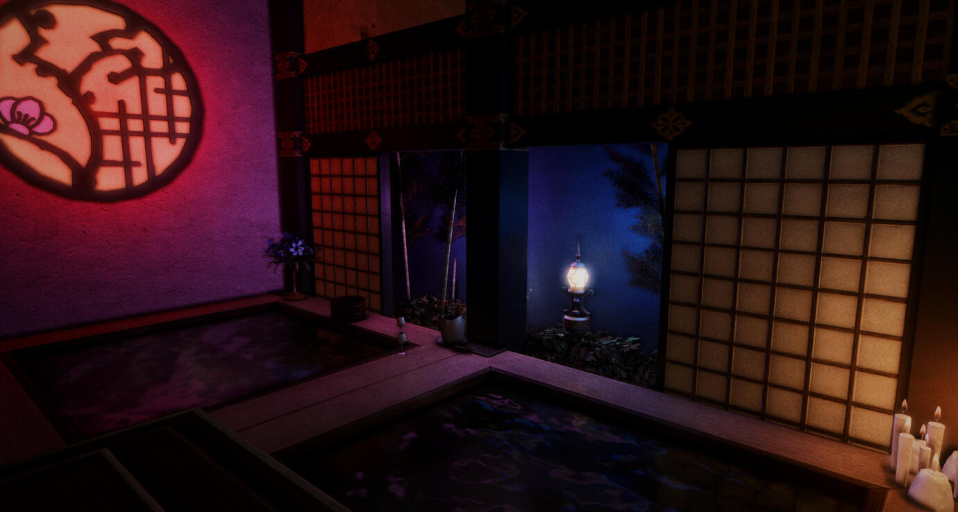 The eponymous baths of the bathhouse feature two separate tubs utilizing as a source that river valley the manor overlooks. The babbling of those distant falls can be heard—even seen by way of the sliding doors lining the walls, transforming the space into an open air bath if one desires. Viewing the stars in their multitudes overhead by night while lounging is a heavenly experience indeed. The fragrant waters of the baths are often infused with the brisk fragrance of juniper berries, and can be either chilled by pumping in directly the naturally cool waters of the river, or warmed by first running the source through the heated plumbing.
